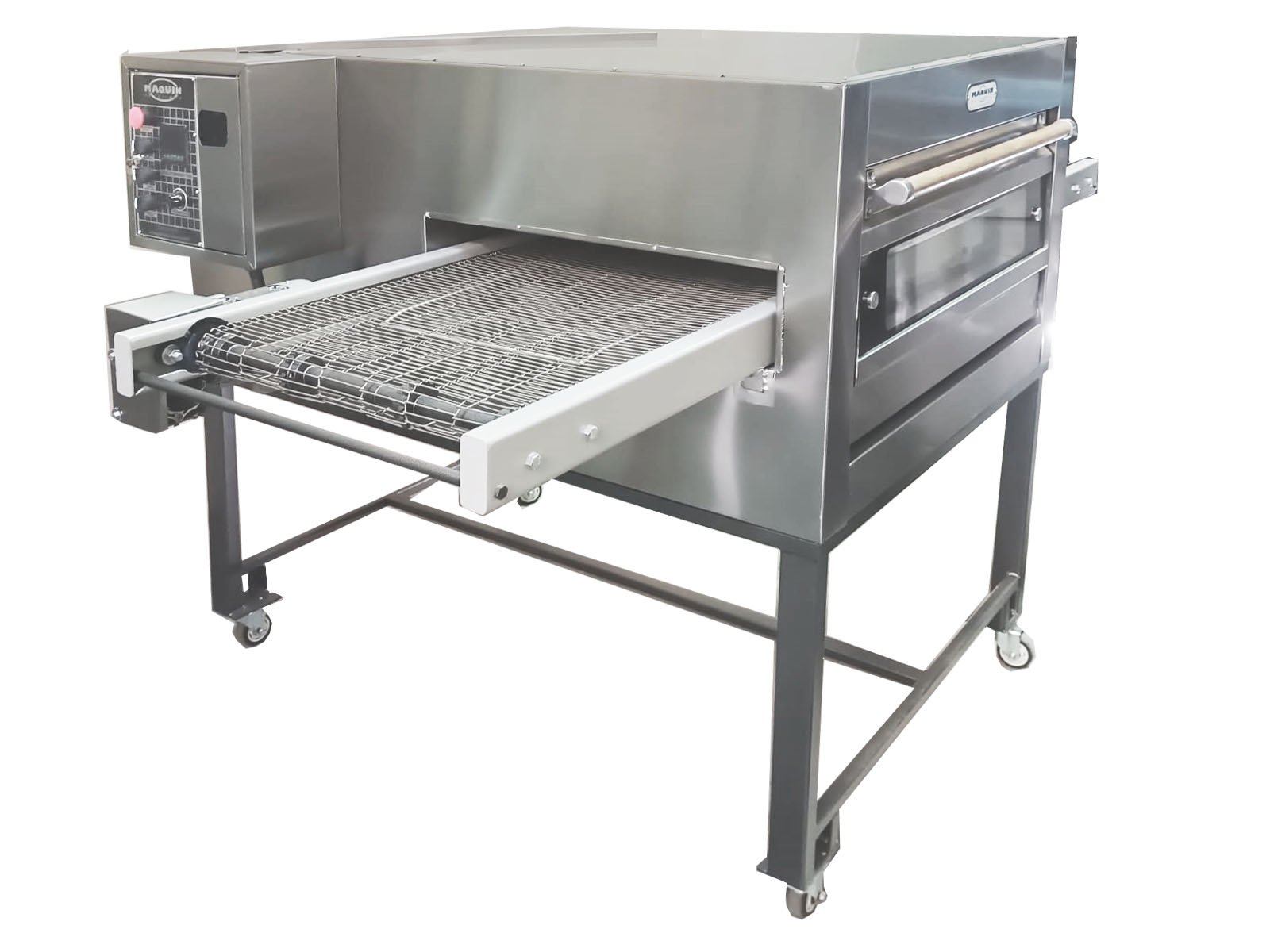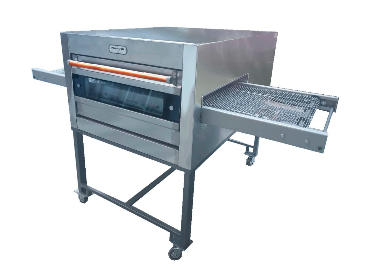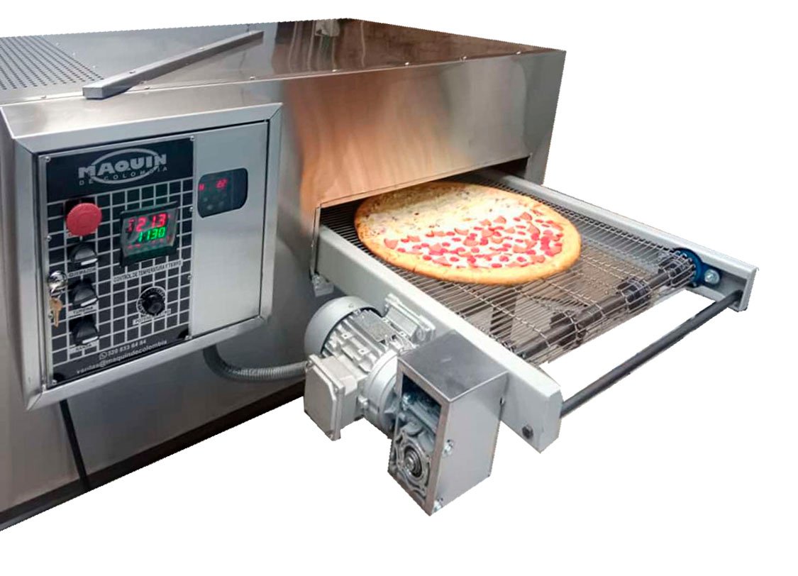 Horno Túnel Para Pizzas es un tipo de horno industrial que emplea un sistema de banda transportadora en acero inoxidable para desplazar las pizzas a través de una cámara de cocción térmicamente controlada. Este tipo de horno está especialmente diseñado para altos volúmenes de producción, Ideal para pizzerías de gran demanda, comedores industriales, y líneas de producción de alimentos.