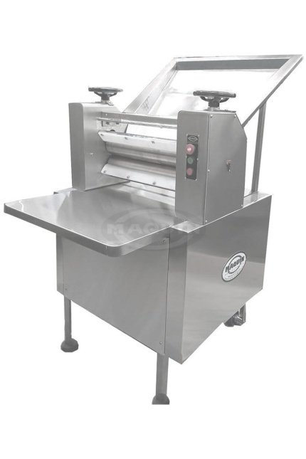 Tajadora de pan, alimentación con banda transportadora superior que permite que los panes se empujen entre sí, uno tras de otro y que llegue al sistema de corte o tajar el pan de forma continua.